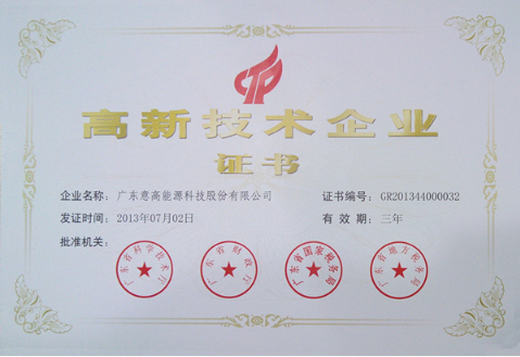 After being approved by Guangdong Provincial Science and Technology Department, Guangdong Provincial Finance Department, Guangdong Tax Bureau and industry experts, our company has passed the technical certification of national high-tech enterprises, and obtained the plaque of "High-tech Enterprises" and "Certificate of High-tech Enterprises" on January 22, 2014 (certificate number: GR201344000032). Successful recognition of "high-tech enterprises" is the support and affirmation of the government for the development achievements of Guangdong Yigao Energy Technology Co., Ltd. since its establishment, and also the concern and support of customers and people from all walks of life for Guangdong Yigao Energy Technology Co., Ltd. The recognition of "high-tech enterprises" represents not only a certificate, but also the recognition of Guangdong Yigao Energy Technology Co., Ltd. from all walks of life. This not only greatly improves the morale of all employees of Guangdong Yigao Energy Technology Co., Ltd., but also makes the company full of confidence in the future development prospects.